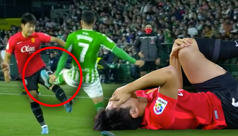 스터드에 무릎이 찍히는 이강인 ㄷㄷ.gif