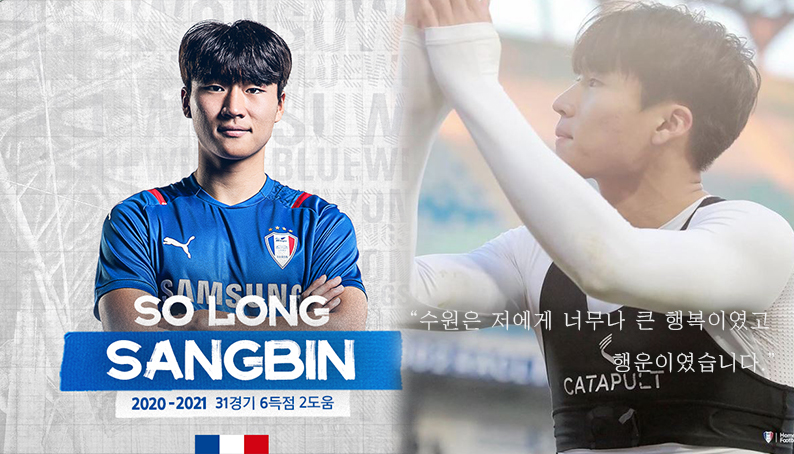 [(공홈) 수원삼성, 정상빈 역대 최연소 EPL 진출!] 수원삼성의 루키 정상빈 선수가 한국 축구 사상 15번째로 잉글랜드 프리미어리그에 진출한다. 수원삼성축구단과 프리미어리그 울버햄튼은 정상빈 선수 이적에 최종 합의했고, 스위스로 출국한 정상빈 선수는 메디컬테스트를 완료하고 입단 절차에 돌입했다. 수원삼성은 시즌 개막을 얼마 남겨두지 않은 상황에서 갑작스러운 영입 제안에 난감한 상황이었지만, 선수의 미래와 도전을 존중하기 위해 대승적 차원에서 이적에 합의했다. 이로써 정상빈 선수는 10대의 나이로 프리미어리그에 진출하는 한국 축구 최초의 선수로 이름을 올린다. 2002년 4월1일생인 정상빈 선수는 19세 11개월의 나이로 EPL에 입성하며, 지난 2011년 선덜랜드로 이적한 지동원 선수의 최연소 진출 기록(20세 1개월)도 경신했다. 수원 소속으로 EPL 직행은 2009년 위건 애슬레틱으로 이적한 조원희 선수 이후 두 번째다. 매탄고 출신으로는 최초다. (기사 전문: http://www.bluewings.kr/news/879010 ) +) 수원 팬들에게 작별인사하는 정상빈 (정상빈 선수 인스타)
