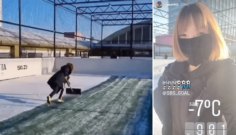 영하 날씨에 눈 쌓인 훈련장 빡세게 제설하는 사오리.gif