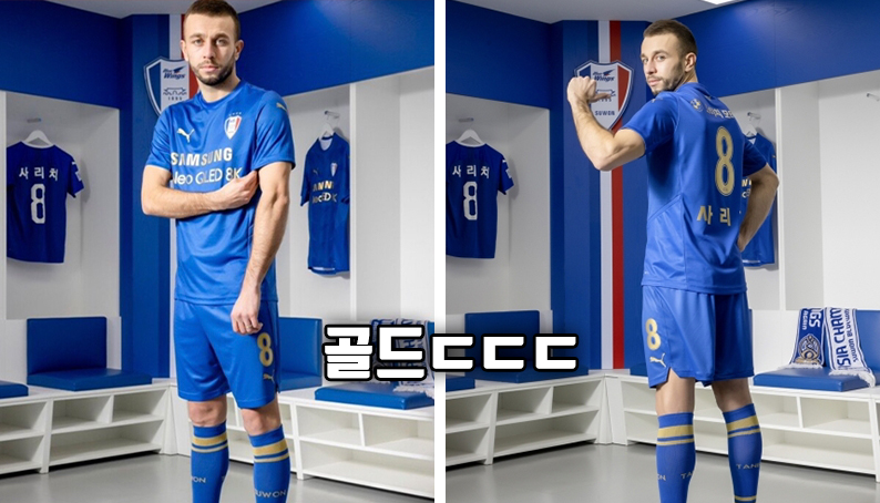[2022 수원 삼성 블루윙즈 유니폼ㄷㄷㄷ(feat.사리치).jpg] 사리치 오피셜과 함께 뜬 푸마의 2022 수원 삼성 블루윙즈 유니폼ㄷㄷㄷ 진짜 골드는 너무 고급스럽네요ㄷㄷㄷ