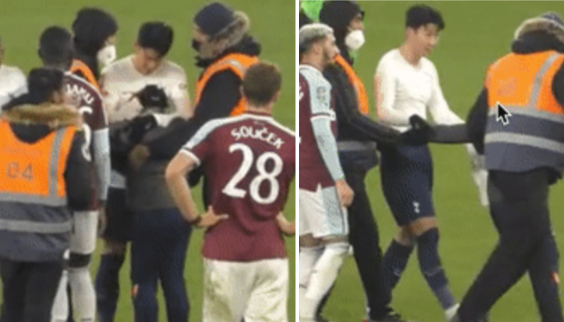 경기 후 그라운드에 난입한 아이에게 유니폼 주는 손흥민.gif