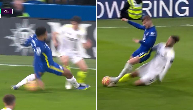 [경기 전반 빡센 태클 하나씩 주고받는 첼시와 리즈ㄷㄷㄷ.gif] 리스 제임스의 옐로먹은 태클ㄷㄷㄷ 얼마 뒤 베르너에게 들어온 살벌한 빽태클ㄷㄷㄷㄷㄷ 뭔가 느낌이 쌔~해지는게...