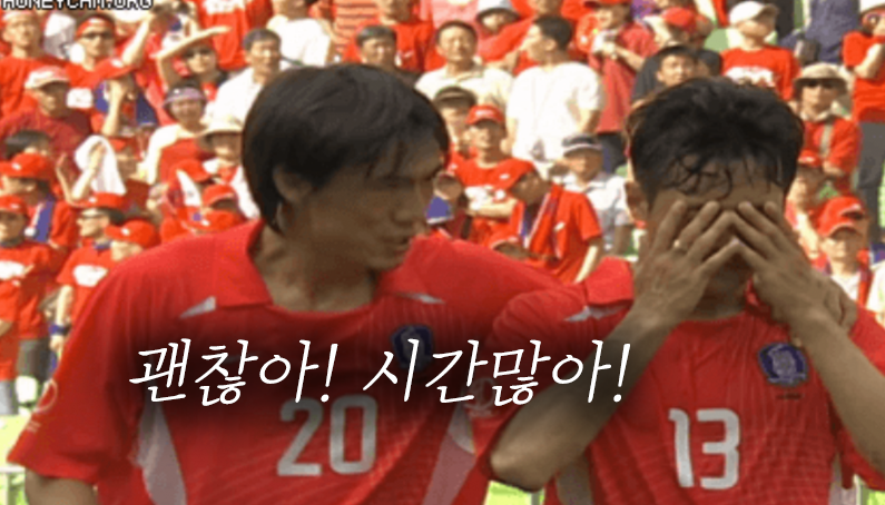 [2002년 월드컵 맏형들의 위로.gif] 이을용의 PK 실축 후 홍명보의 위로 "괜찮아 아직 전반이야 시간많아 힘내자" 설기현이 아쉽게 찬스를 놓친 후 황선홍의 격려.... 크....이런 장면들을 다시 보면 2002년은 분위기가 너무 좋았다고 생각이 드네요....