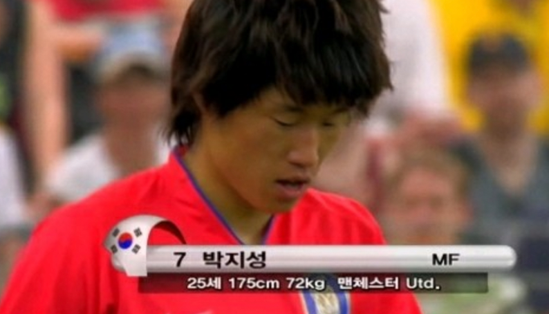 [25세 맨체스터 유나이티드 소속.gif] 06년 독일 월드컵 토고전. 박지성의 플레이들 볼 커트 후 옐로 카드 유도 볼 터치 한방으로 위협적인 돌파를 만들어 낸 박지성. 그리고 두 번째 옐로 카드 유도 (경고 누적 퇴장) (박지성이 만든 프리킥을 이천수가 득점) (박지성의 오프더볼에 속는 토고 수비들. 그로 인해 자유로워진 안정환의 역전골) 아래는 박지성과 안정환의 원터치 플레이 대한민국의 월드컵 원정 첫 승!