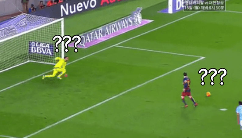 [이상하지만 '규정에 위배 안되는 PK' 방법] 2016년에 나온 메시의 PK 장면. 이 골을 넣으면 메시는 300골 달성이었지만, 수아레스의 해트트릭을 위해 골을 양보. 뭔가 어색하지만 전혀 규정에 문제가 없는 PK 방법이다.