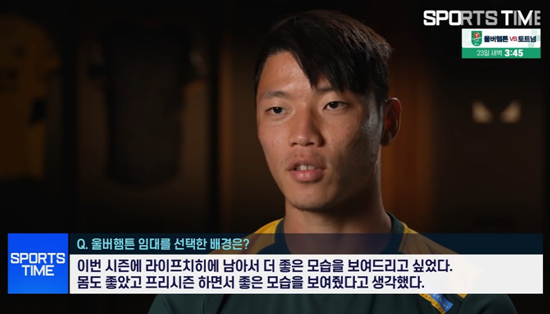[황희찬 "라이프치히, 핑계대고 뛸 기회 안줬다"] 울버햄튼 임대신분인데 강하게 인터뷰를 했군요ㄷㄷㄷㄷ 출처 : https://www.skysports.com/football/news/11699/12413307/hwang-hee-chan-exclusive-interview-wolves-new-loan-signing-from-leipzig-on-being-the-new-bull-at-molineux / 짤출처 : SPORTS TIME