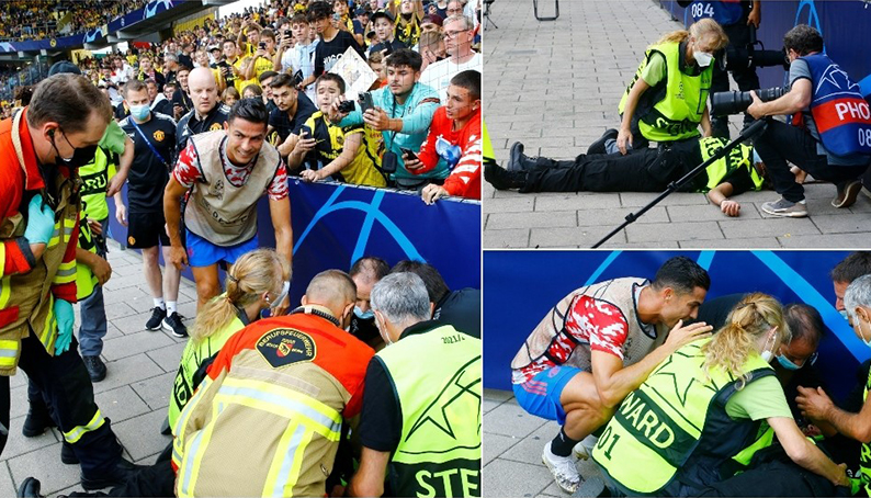 경기전 웜업에서 호날두의 슈팅을 맞고 쓰러진 안전요원 결말ㄷㄷ.gif