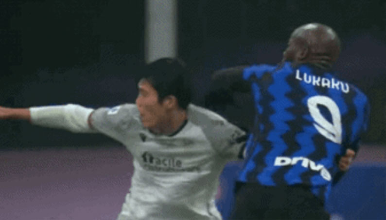 일본 수비수 도미야스가 체감한 루카쿠의 피지컬.gif