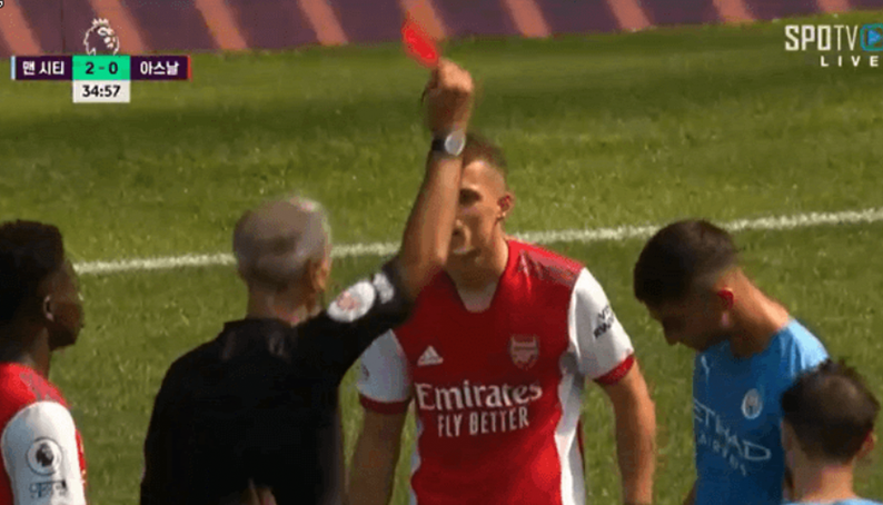 [실시간 다이렉트 퇴장으로 경기 터트리는 자카의 태클.gif] 결국 경기를 터트려버리는 자카의 거친 태클... 출처 : 뉴락싸_정에린