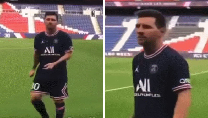 아직은 어색한 '다른 유니폼' 입은 메시의 모습.gif