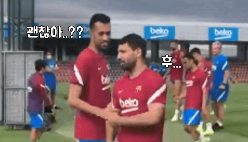 [훈련장에서 선수들에게 위로받는 아구에로.gif] 힘 없이 터덜터덜 걸어가는 아구에로를 씁슬한 미소로 위로해주는 부스케츠와 알바 진짜 어떤 심정일지....ㅠㅠ 출처 : 뉴락싸_라시현