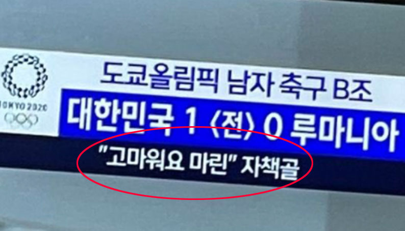 [루마니아 축구 트위터 "한국 공영방송이 마린을 조롱했다"] 어제 루마니아의 마린 선수가 자책골 넣은 뒤 MBC가 넣은 자막.. 루마니아 축구 정보 트위터에도 이 자막이 알려졌네요 https://twitter.com/RoFtbl/status/1419300668158922759