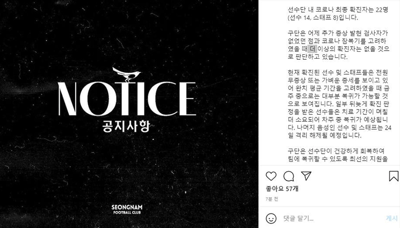 [성남FC, 코로나19 최종 확진자 총 22명] 선수단 내 코로나 최종 확진자 22명. 선수 14명, 스태프 8명. 7월 20일(v인천), 24일(v대구), 28일(v포항)로 예정된 3경기는 연기 (공홈: https://www.seongnamfc.com/media/notice/view?__current_page=1&__page_size=10&query_cond=query_title&query_value=&board_seq=441 )