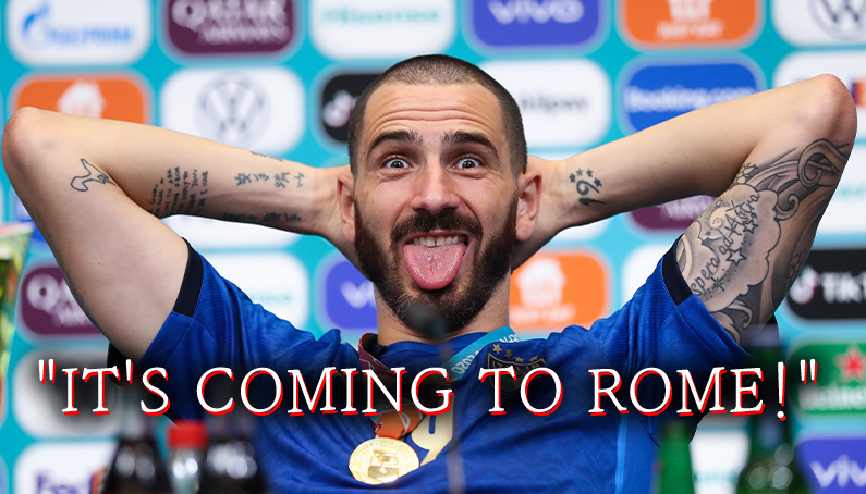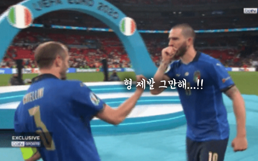 [유로 우승 직후 잉글랜드 저격하는 보누치.gif] "It's coming to Rome!" -> 이는 잉글랜드의 응원가 중 "It's coming to Home!" 문구를 바꾼 것이라고 합니다. 즉, 잉글랜드가 66년 월드컵 이후로 50년 넘게 무관이지만 축구종가라고 응원할 때 우승컵이 It's coming home(집으로 온다) 라고 말 한것을 그걸 보누치가 It's coming to rome(그건 로마로 간다)고 한글자만 바꿔서 저격한 것... 잉글랜드의 꿈을 또한번 무너뜨린 보누치.. 출처 : 에펨코리아_Kineker