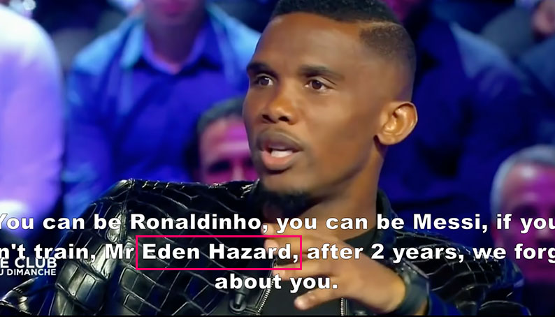 [4년 전, 아자르에게 경고했던 에투의 발언.txt] -2017년 프랑스 방송 중- “난 아자르에게 얘기할때 호나우딩요를 예시로 들고 말해줬다. 호나우지뉴는 당시에 세계 최고, 어쩌면 역대 최고였을 정도로 엄청난 선수였다. 그러나 매일 훈련하지 않는 선수는 꼭 댓가를 치르게 된다. 너가 호나우지뉴든, 메시든.. 아자르, 훈련하지 않는다면 2년 뒤에 너를 잊을것이다. 축구는 빨리 변하기 때문이다. 새로운 유망주가 나와서 더 잘하는게 축구다.” (2분 58초) https://www.youtube.com/watch?v=YwmdqUu0uaQ 출처 : 뉴락싸_Four Four Two님 작성 글