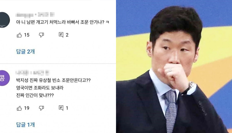 ["박지성은 유상철 조문 안 가냐?" 비난 받고 있는 박지성] (아래는 박지성 부인 유튜브에 달린 악플들.. 이 상황에 이런 게 논란되는 게 참 슬프네요) 출처 : https://sports.news.naver.com/news.nhn?oid=396&aid=0000583604