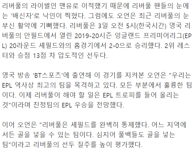 [배신자로 찍힌 오언, 리버풀 극찬]