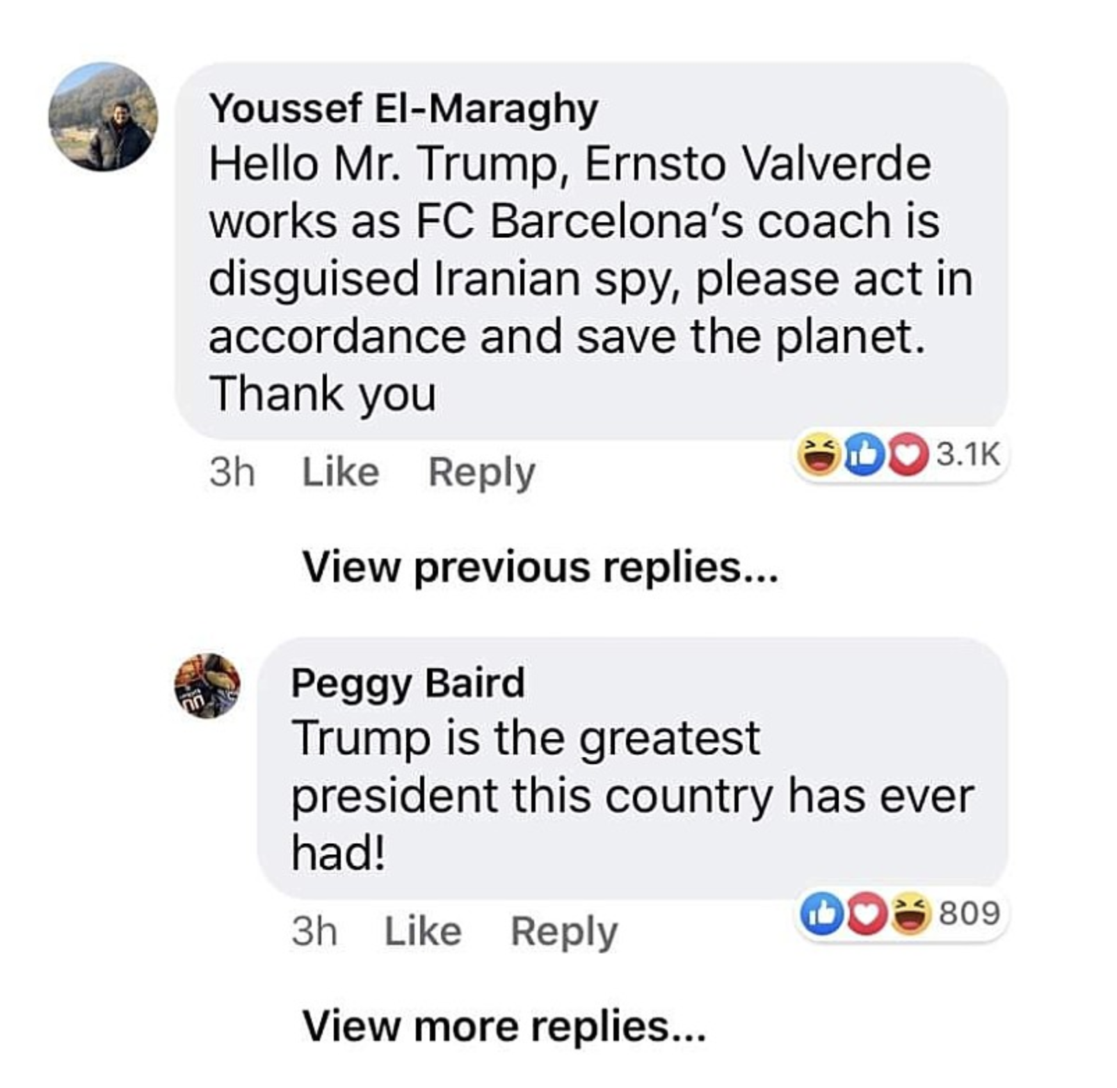 -안녕하세요. 트럼프 대통령님, 에르네스토 발베르데라는 이란 국적의 스파이가 현재 FC 바르셀로나 감독으로 위장하여 일하고 있습니다. 이에 대한 조속한 처분으로 이 세상을 구해주세요. 감사합니다.