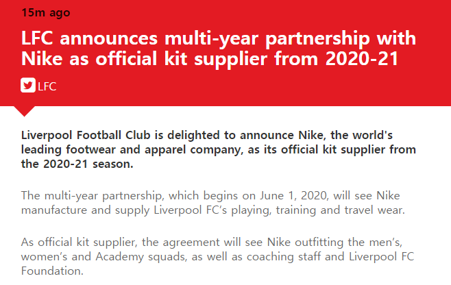 출처 : https://www.liverpoolfc.com/news/announcements/381644-liverpool-fc-announces-multi-year-partnership-with-nike-as-official-kit-supplier-from-2020-21