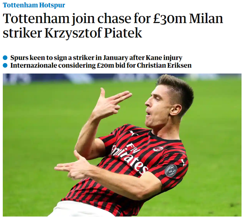 토트넘은 케인의 장기 부상에 대응하기 위해 AC 밀란의 피옹텍을 노린다. 즐라탄 이브라히모비치를 영입한 AC밀란은 지난 1월에 제노아에서 피옹텍을 데려 오기 위해 지불한 3천만 파운드를 회수할 수 있다면 폴란드의 24세 선수인 피옹텍을 팔 준비가되어 있다 .
