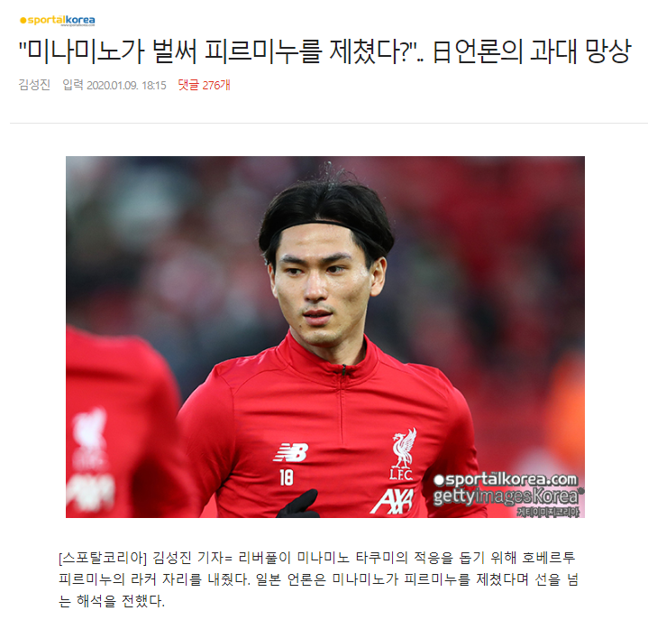 -그런데 9일 일본 ‘도쿄스포츠’는 “프리미어리그 명문 리버풀에 데뷔한 미나미노가 벌써 브라질 대표팀 공격수를 밀어냈다?”라고 보도했다. 브라질 대표팀 공격수는 피르미누를 의미한다.