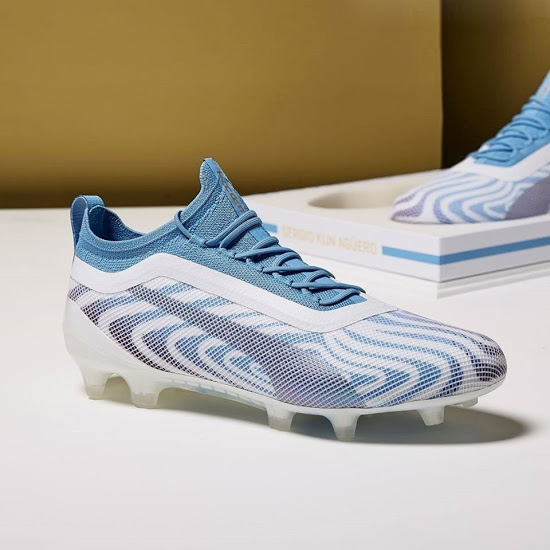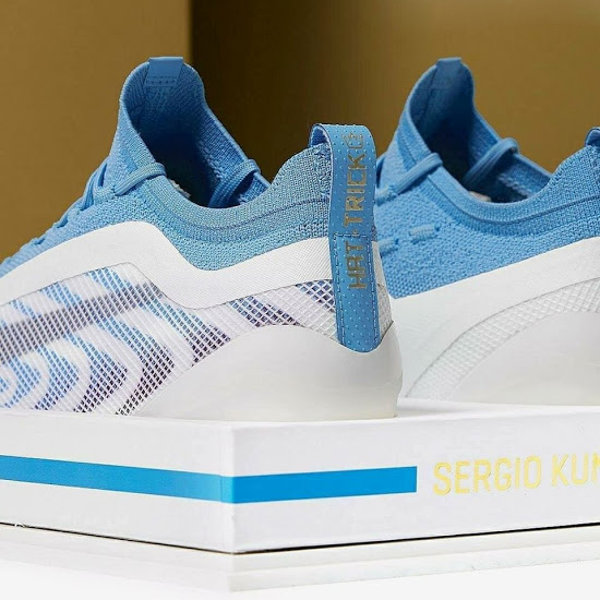 이 축구화는 맨체스터 시티 컬러로 제작되었고 독특한 소용돌이 모양의 하늘색과 흰색 디자인이 돋보입니다. 또한 아구에로의 업적에 걸맞은 골드 컬러로 텅 부분의 니트에는 “Three”, 뒤꿈치 부분에는 “Hat-trick”과 왕관 문양이 새겨져있습니다.