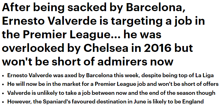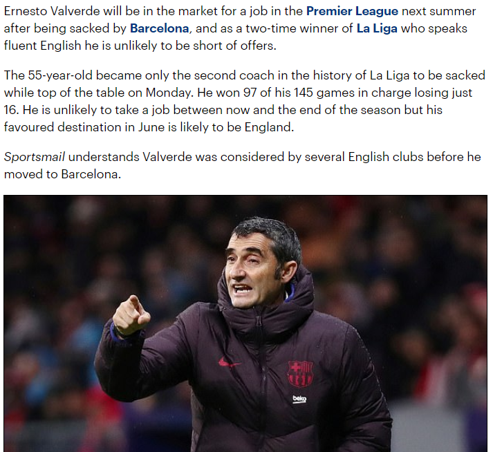 요약 : 바르셀로나에서 경질된 발베르데는 프리미어리그 감독직을 노리고 있다. 영어가 유창한 발베르데는 바르셀로나 부임 전에도 프리미어리그 팀들의 제안을 받은 적이 있다.