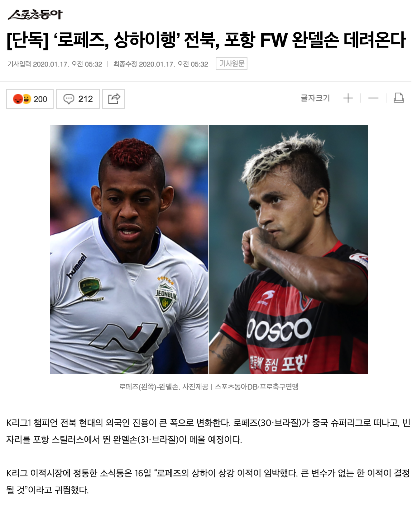[‘로페즈, 상하이행’, 포항 FW 완델손 전북행?]
