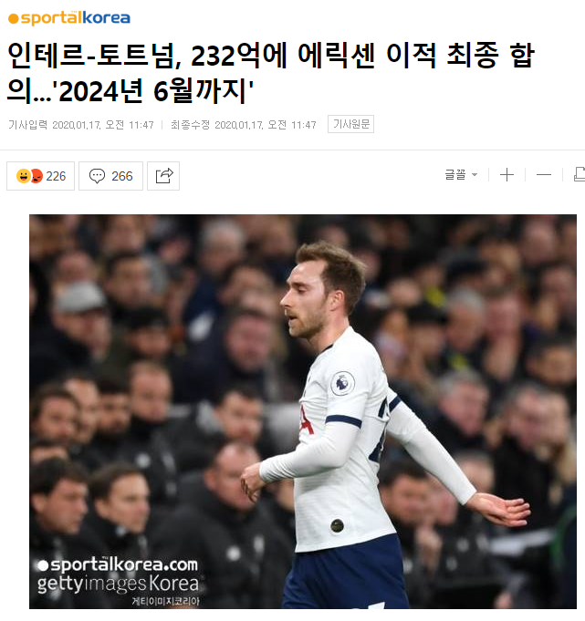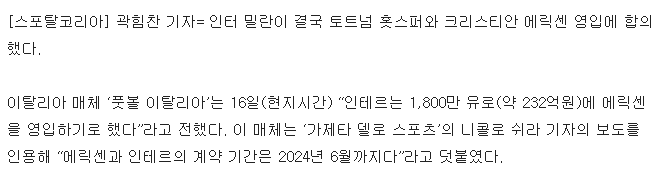 [인테르, 1,800만 유로에 에릭센 영입 합의]