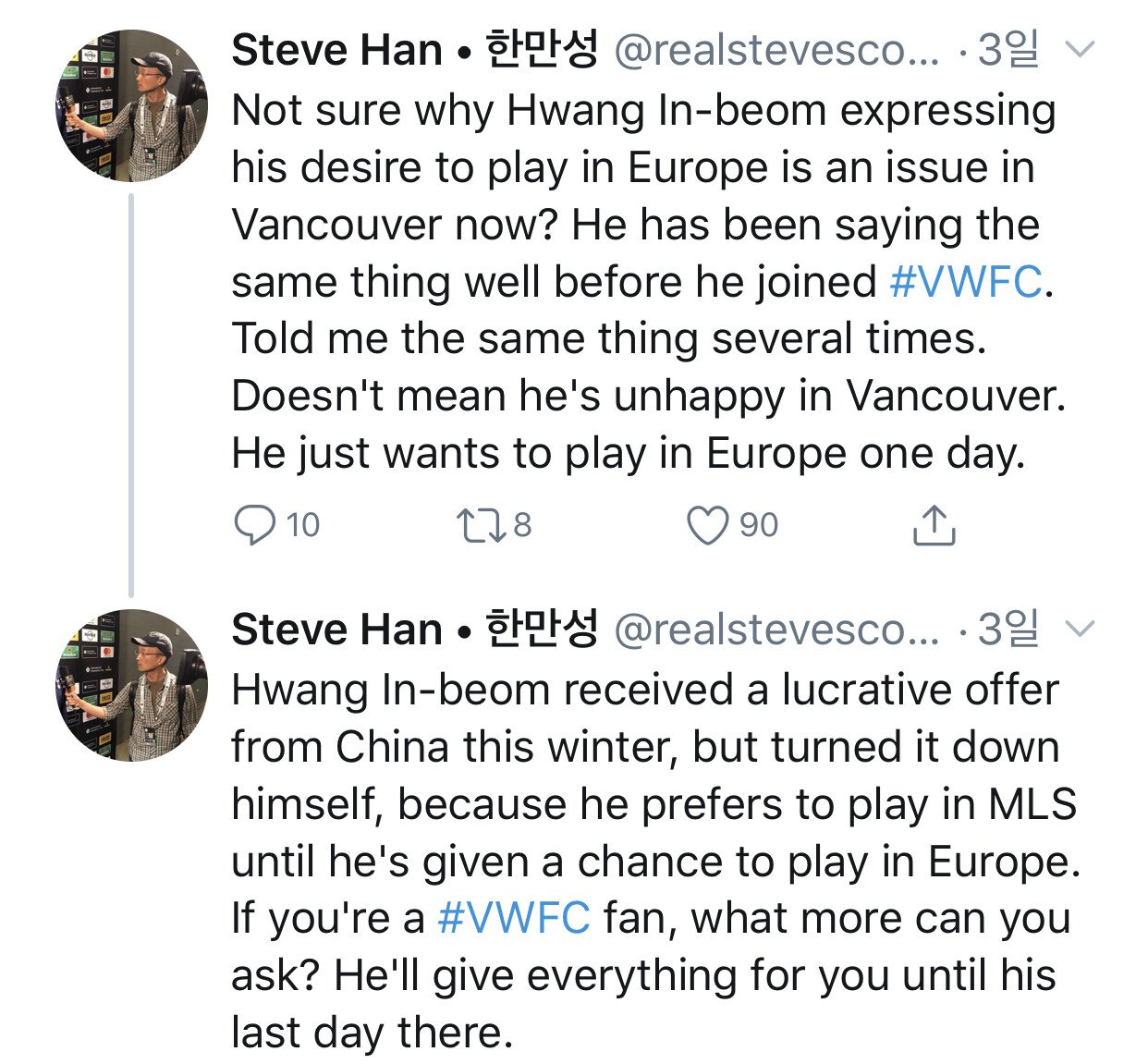 황인범은 이번 겨울에 중국으로부터 엄청난 오퍼를 받았다, 그러나 그는 거절하였다, 왜냐면 그는 유럽에서 뛸 기회를 받기 전에는 MLS에서 뛰는것을 선호하기 때문이다. 만약 당신이 벤쿠버 팬이라면, 요구할 게 더 있다고 생각하나? 그는 벤쿠버에서 뛰게 되는 마지막까지 자신의 모든것을 주고 갈 것이다. “