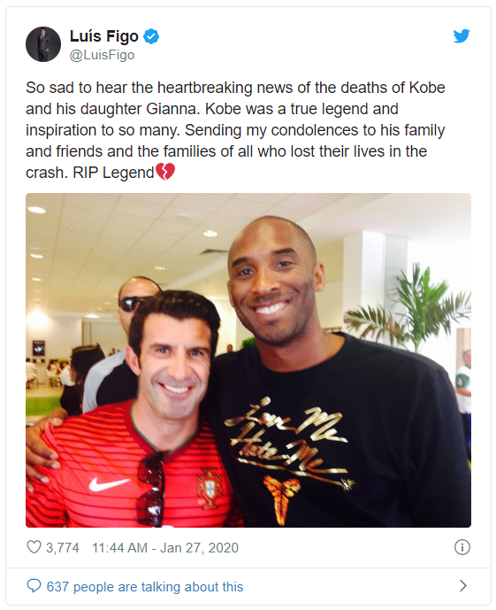헬기 추락 사고로 세상을 떠난 코비 브라이언트를 추모한 루이스 피구. 그런데 호날두의 SNS에 올라온 추모 글과 내용이 똑같아서 호날두의 글을 복사 붙여넣기 한 게 아니냐는 의심을 받고 진정성이 없다고 비난을 받고 있다고 하네요. (참고로 호날두와 피구는 같은 에이전시도 아니고 홍보팀도 다르다고 하네요) 아래는 호날두의 추모 글과 피구의 추모 글..
