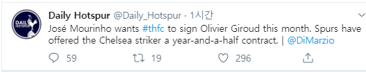 -토트넘은 지루에게 18개월 계약 오퍼, 무리뉴 또한 지루를 원함