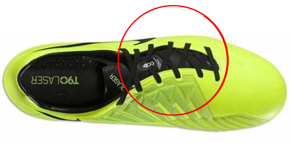 그리고 두 번째는 토탈 90에서 볼 수 있었던 ‘비대칭 슈 레이싱 설계’라고 합니다. 끈을 바깥쪽으로 치우치게 만들어 스트라이크 존에 어떠한 장애물도 없게 만드는 설계 방식입니다.