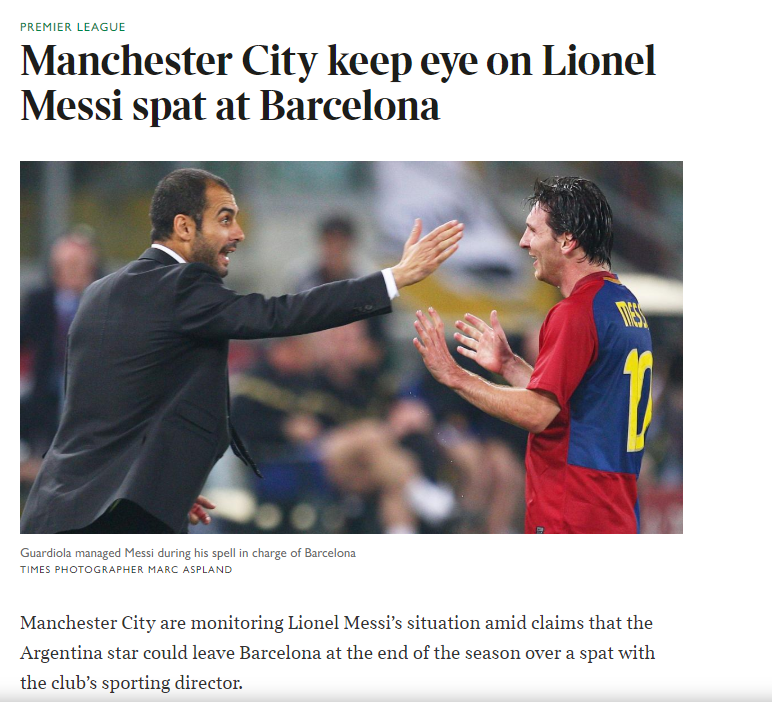 [타임즈] - 맨체스터 시티는 그 아르헨티나 스타가 감독과의 말다툼으로 시즌 말에 바르셀로나를 떠날 수도 있다는 주장 속에 리오넬 메시의 상황을 감시하고 있다.