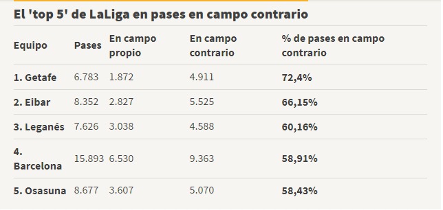 헤타페는 총 6,783개의 패스 수를 기록하며 최소 패스 수를 기록했지만 상대 진영에서의 패스 비율이 72.4%에 달하며 라리가에서 최고의 비율을 가졌습니다. 또한 롱 패스의 비율이 가장 높으며 다이렉트 축구는 성공적이었습니다. 방어에 빛나고 공격에 효율적입니다.