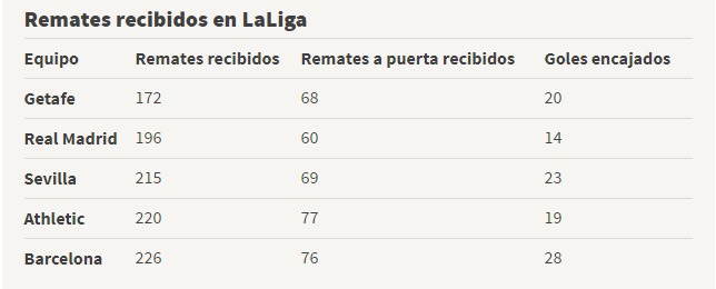 헤타페는 가장 낮은 개수의 슛팅을 허용하였으며, 실점 역시 적습니다.