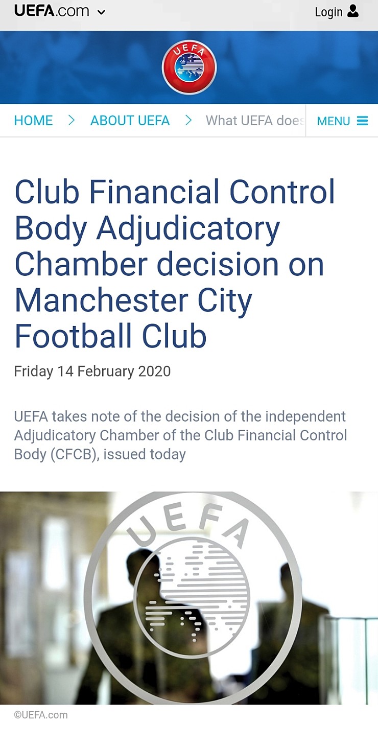 “Following a hearing held on 22 January 2020 the Adjudicatory Chamber of the UEFA Club Financial Control Body (CFCB), chaired by José da Cunha Rodrigues, has today notified Manchester City Football Club of the final decision on the case which was referred by the CFCB Chief Investigator.
