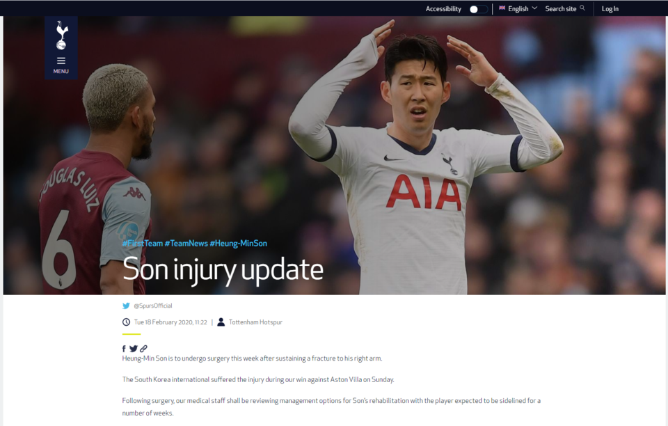 [[오피셜]손흥민 오른팔 골절로 이번주 수술]