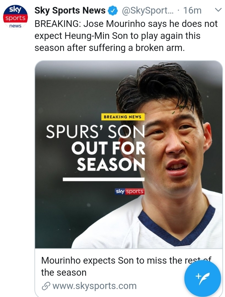 [무리뉴 “Bad news. 손흥민 시즌 아웃”]