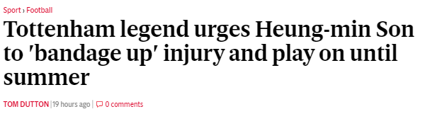 | 토트넘 레전드 "손 수술 연기하고 계속 뛰어달라" | |