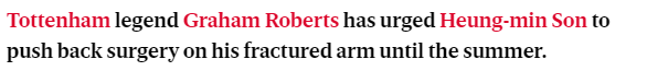 [이브닝스탠다드] 토트넘 러젠드 Graham Roberts는 흥민손의 팔수술을 여름까지 미루기를 촉구했다..