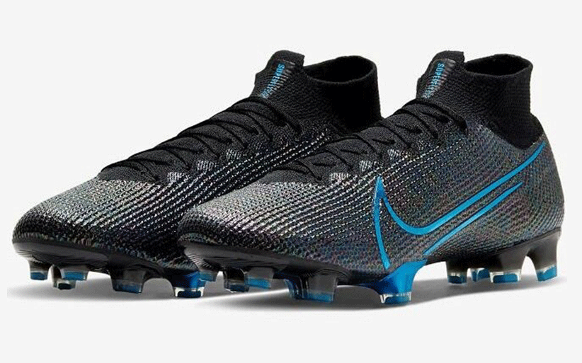 다시 축구화로 돌아와서 디자인에 대한 설명을 간략하게 하면, 어퍼 전체가 검은색으로 덮혀져 있으며 스우시, 아웃솔 부분에 강렬한 푸른색이 사용되었습니다. 어퍼도 자세히 보면 반짝반짝 빛나도록 했죠. 검은색을 주로 사용했지만 굉장히 화려한 인상을 주고 있습니다.