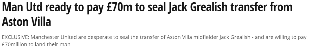 맨체스터 유나이티드는 올 여름 잭 그릴리쉬를 영입하기 위해 필사적이며, 그를 영입하기 위해 70m 파운드를 지불할 의향이 있다.