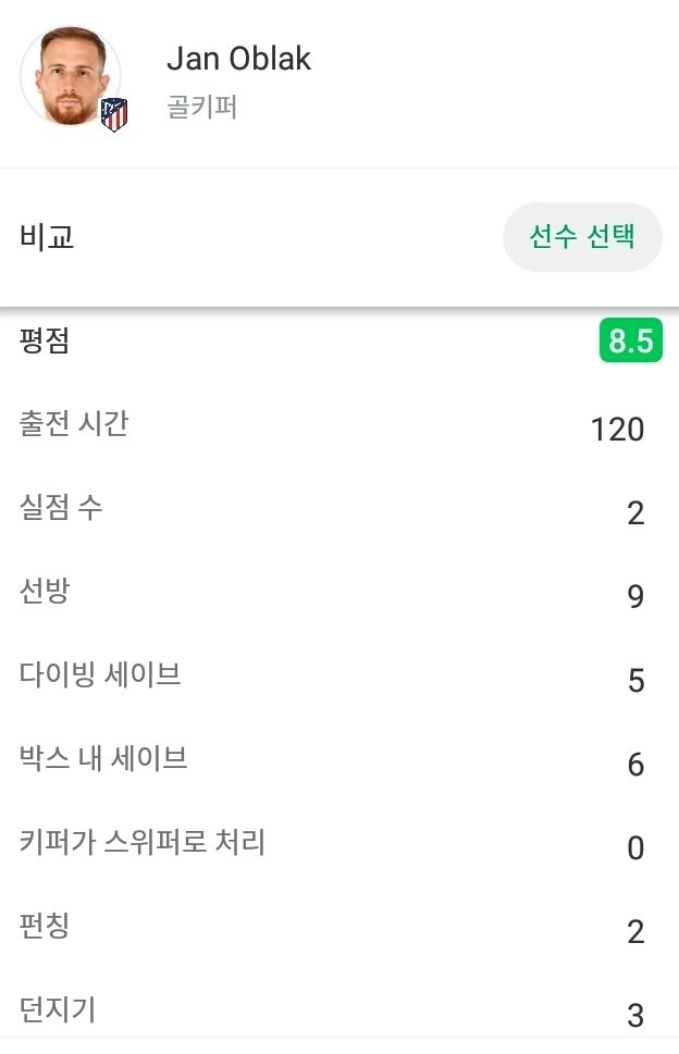 골키퍼인데 평점 8.5라니ㅋㅋㅋ 그리고 선방 9에 다이빙 세이브 5 ㄷㄷ