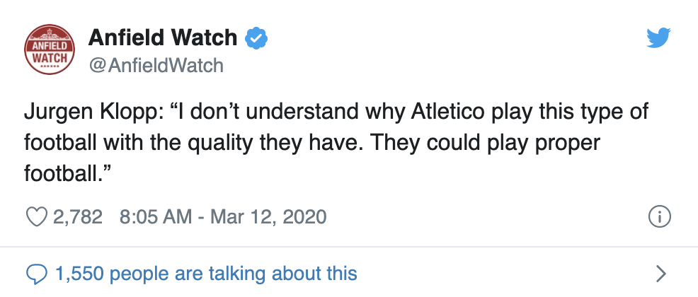 클롭 : 알레띠가 왜 그런 축구를 하는지 이해가 안된다. 알레띠는 왜 좋은 퀄리티의 선수를 가지고도 이런식의 축구를 하는지 이해가 되지 않는다. 그들은 그들에게 맞는 축구를 할 수 있을텐데 월클 선수들이 두줄 수비를 세우고 있고 그들은 심지어 역습조차도 하지 않는다. 저는 오늘 제 선수들이 자랑스럽다.