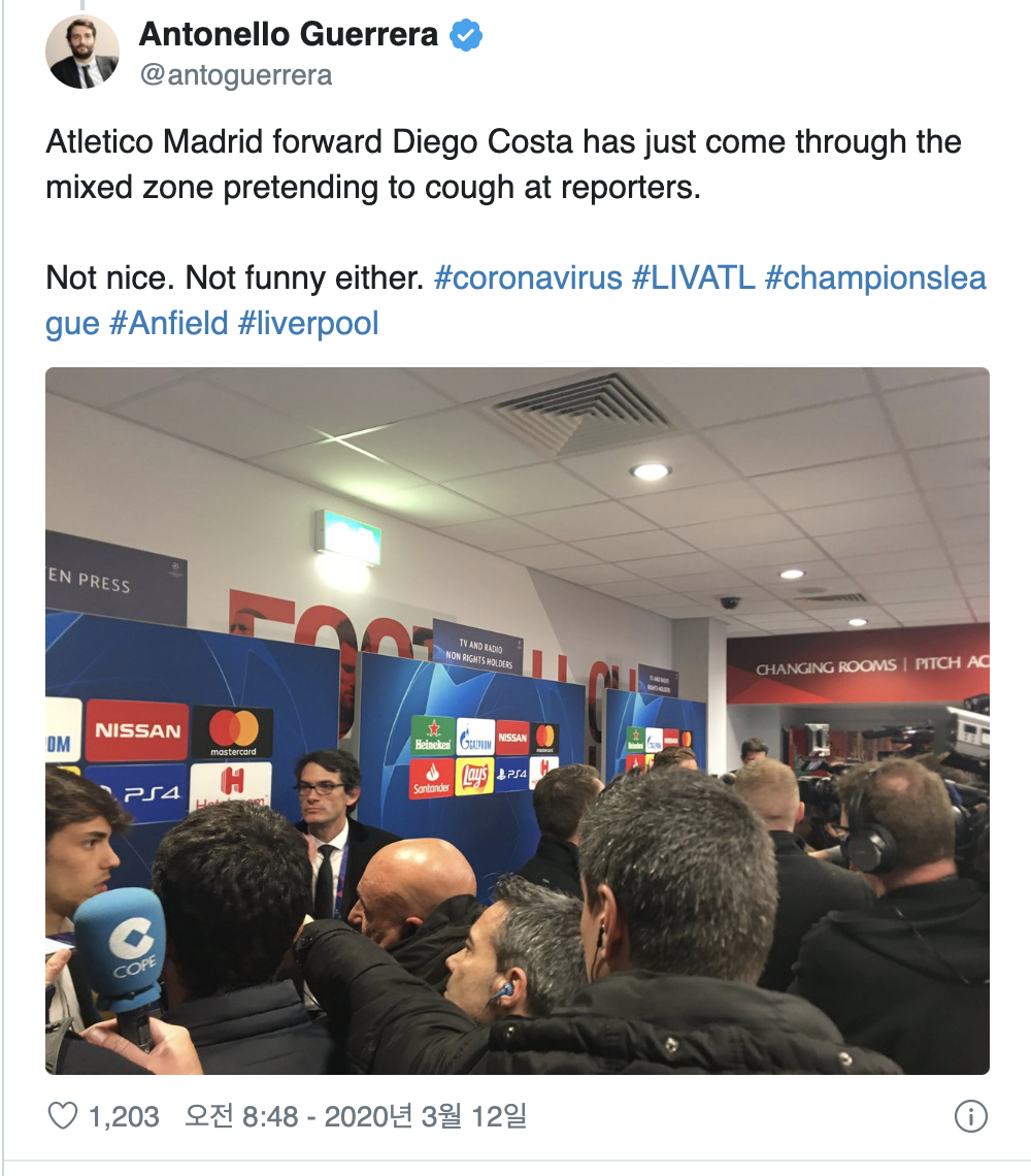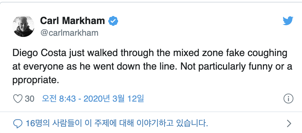 경기 종료 후 선수들 인터뷰 중인 믹스트존 지나가면서 기침하는 척 하면서 지나간 디에고 코스타