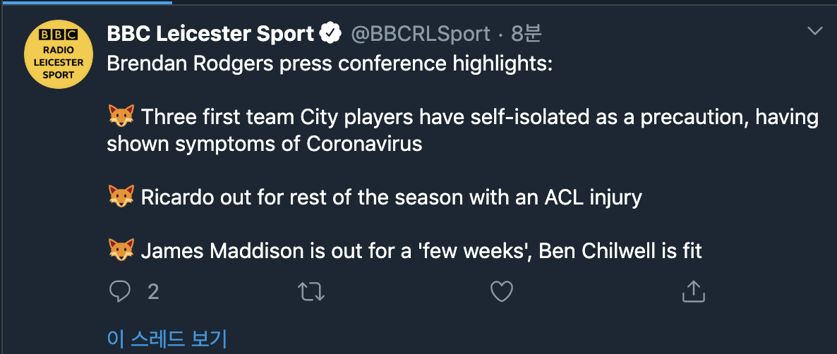 [[속보]EPL에서 코로나 증상을 보인 팀은 레스터 시티]