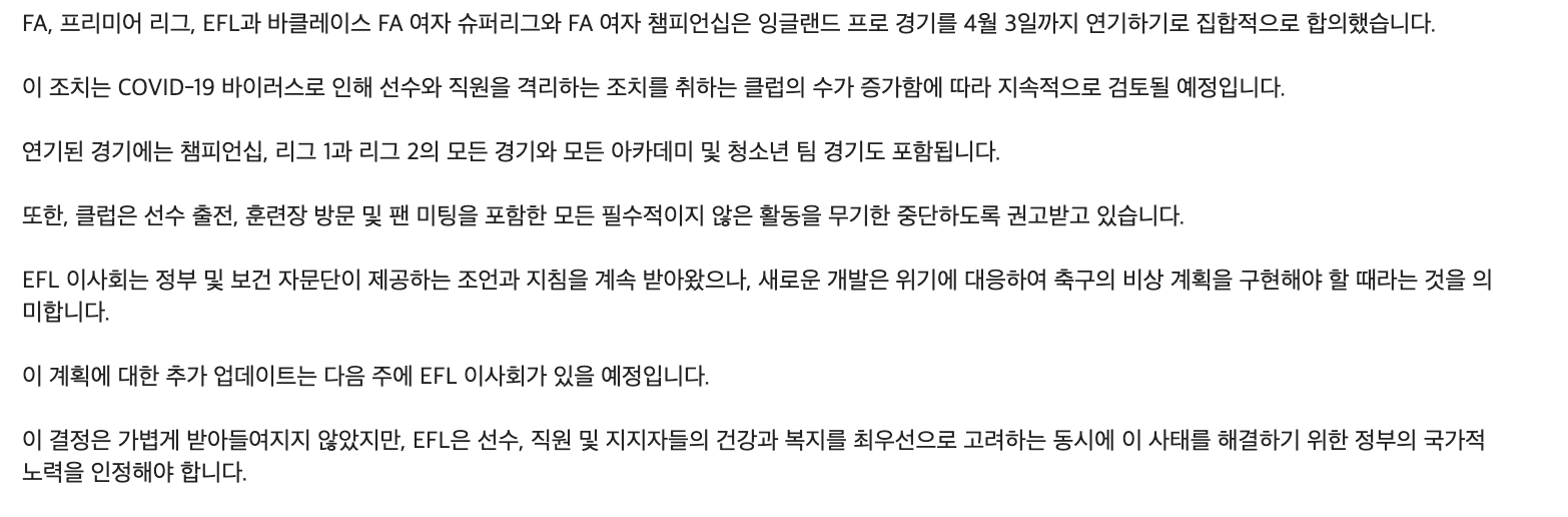 EPL 프리미어리그 뿐 아니라 FA, EFL, FA WSL, FA WCL 모두 4월3일까지 리그 중단 합의