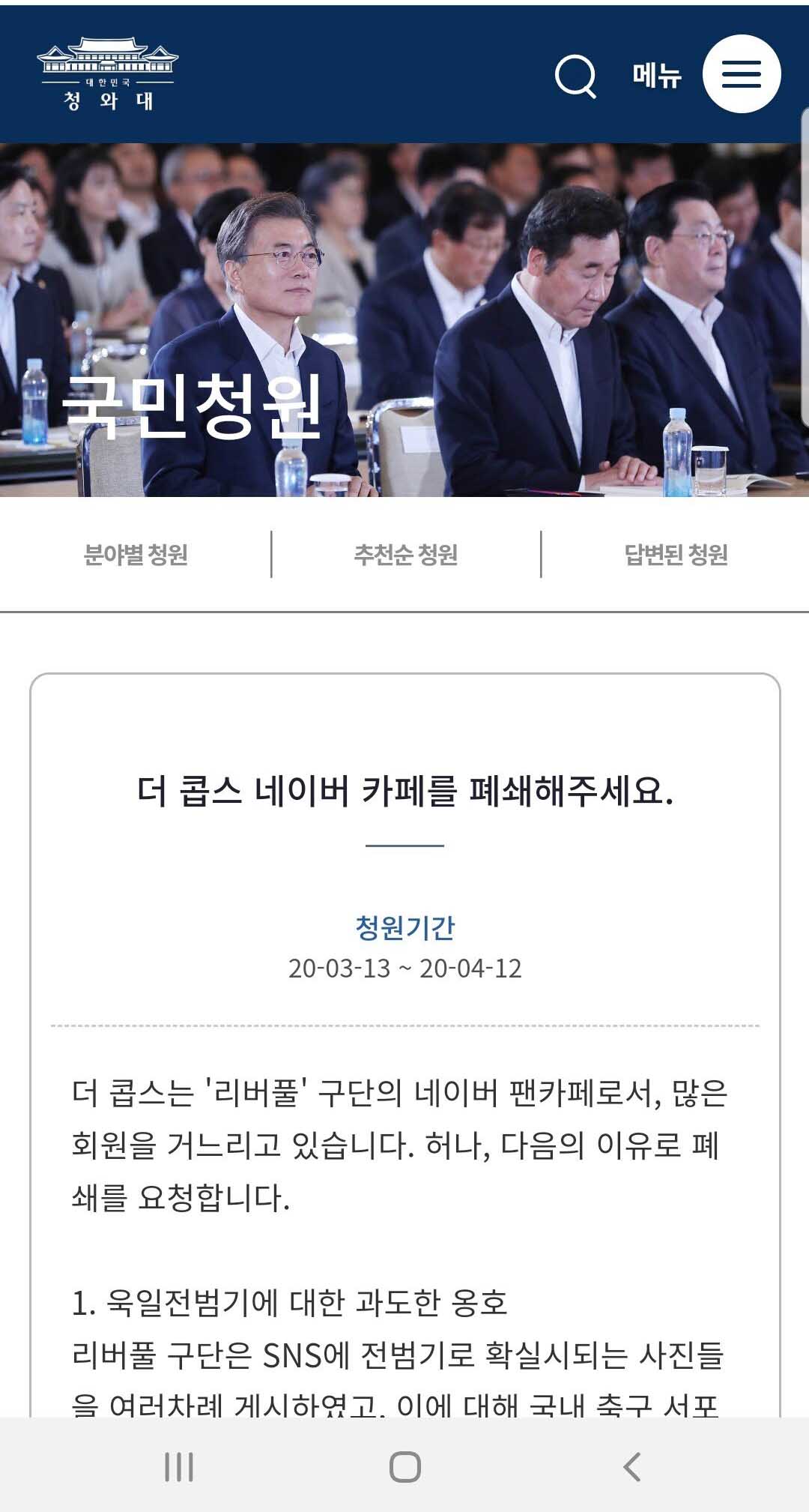 청와대 국민청원 게시판에서 리버풀이 왜 나와...?????