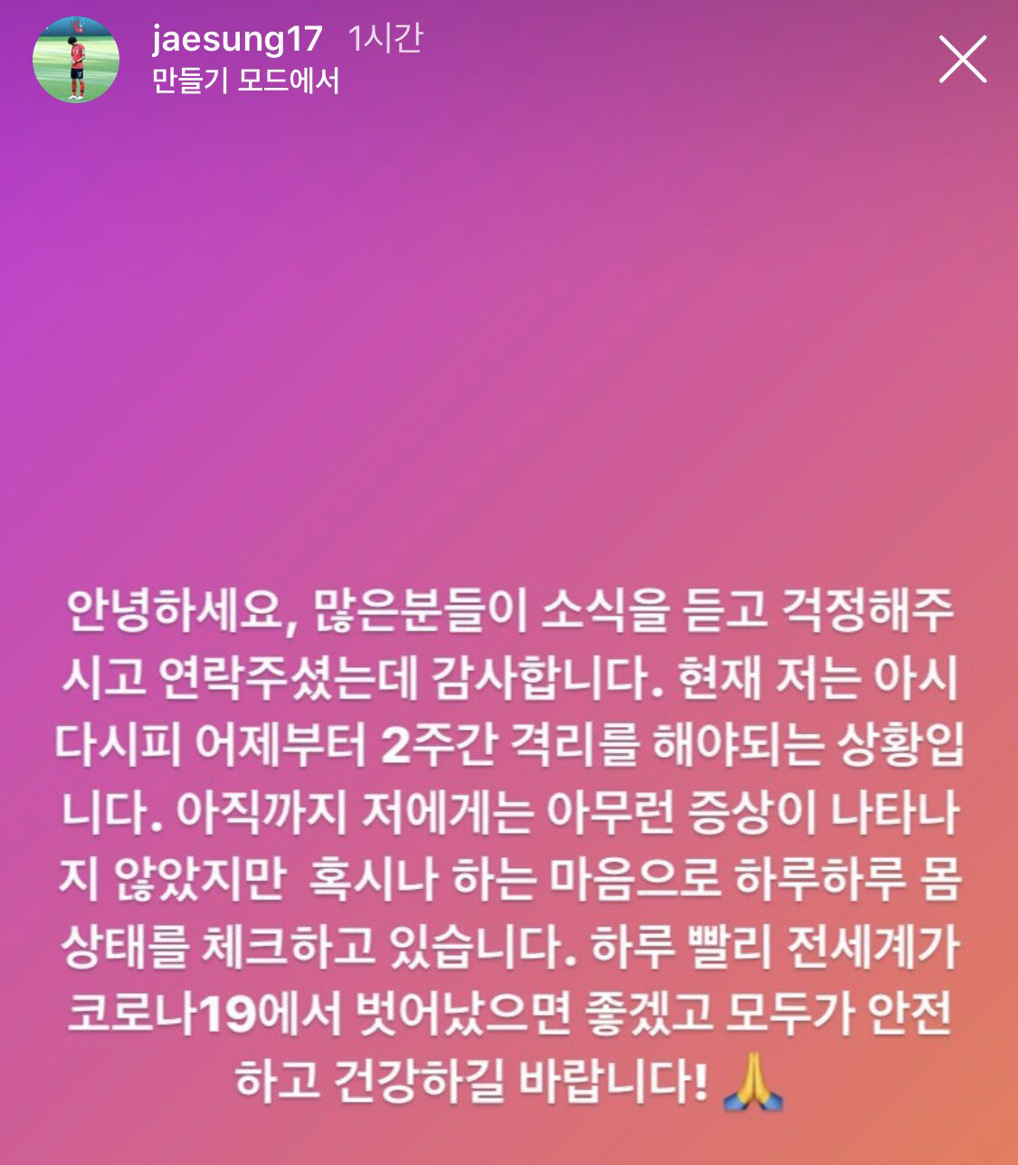 팀에 확진자가 나와서 자가격리에 들어간 이재성 선수..
